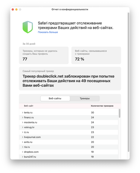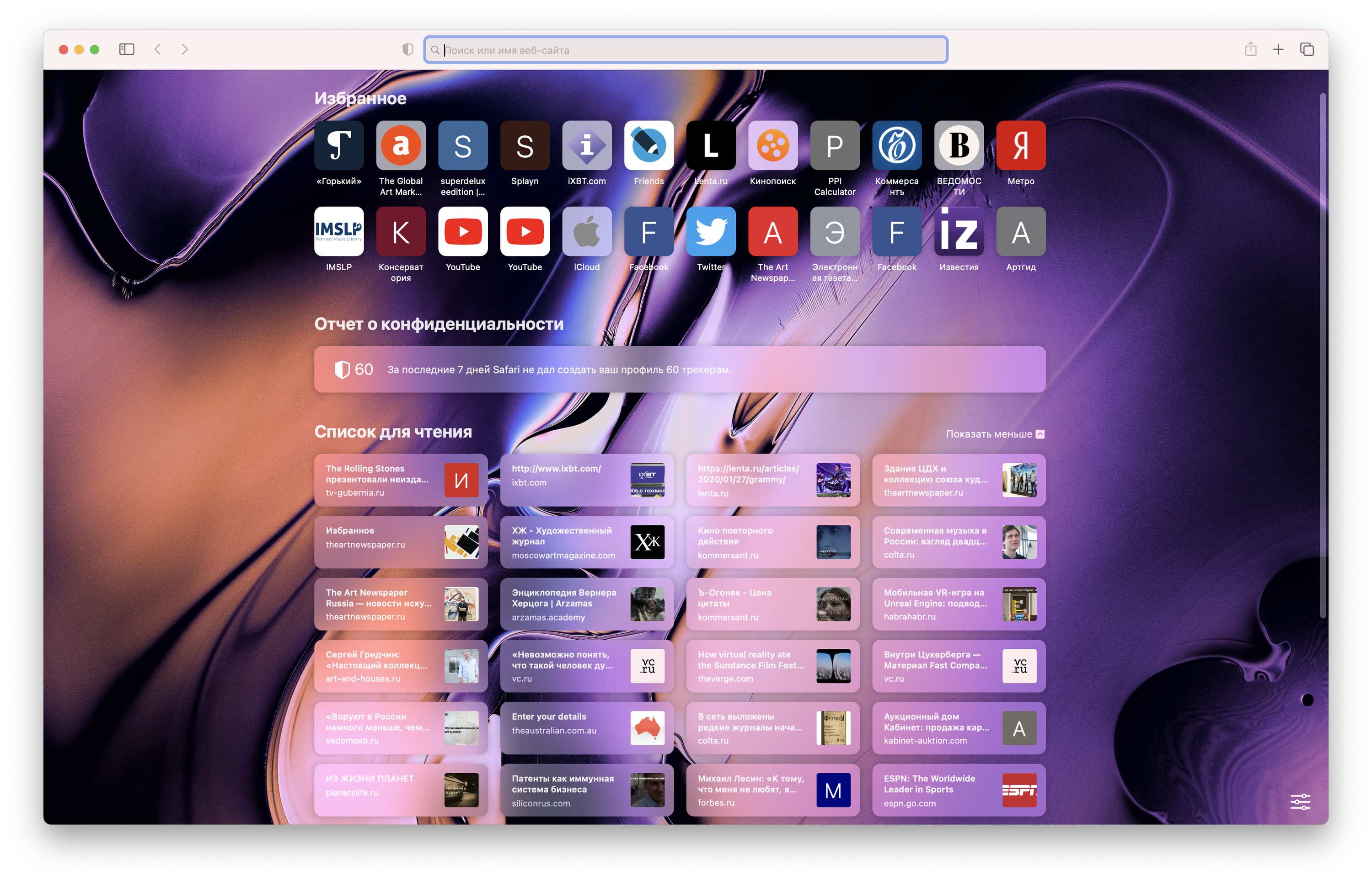 Не то чтобы это приносило какую-то существенную пользу. Но, пожалуй, приятно знать, что за тобой действительно никто не следит. Кроме того, гипотетически, среди трекеров могут оказаться и не самые безобидные. Так что, как говорится, пусть будет. Что же касается удобства и эстетики, здесь стоит обратить внимание на стартовую страницу. Там теперь не только Избранное, что и Отчет о конфиденциальности, и Список для чтения, и вкладки iCloud (полезно, если вы работаете на одном Mac дома, а на другом — в офисе).