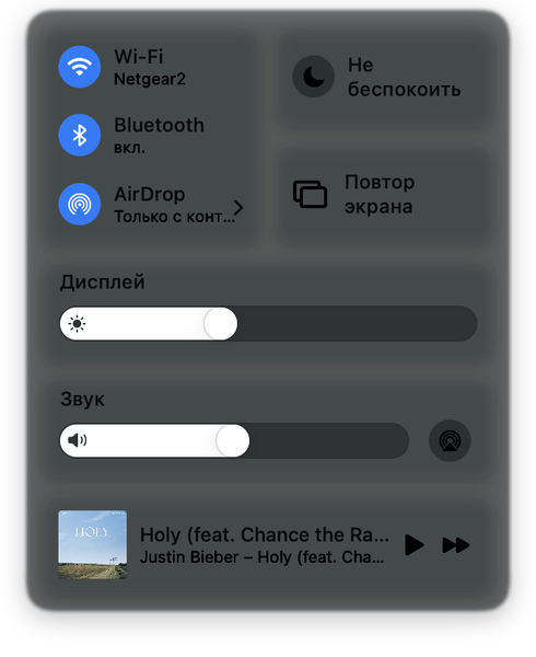 Существенно изменилась панель в правом верхнем углу рабочего стола macOS. Теперь там есть значок, щелкнув по которому, мы увидим вот такое окно (на скриншоте оно почему-то получается темным, хотя на самом деле — светло-серое).