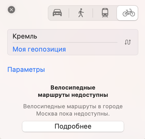 Ну а обещанные в macOS Big Sur веломаршруты действительно недоступны, хотя соответствующий значок в приложении появился.