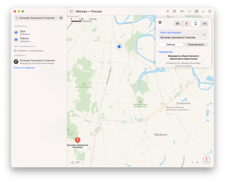 Далее, Apple Maps по-прежнему не могут построить маршрут на общественном транспорте между двумя точками — даже в Москве. Можете проверить сами — см. скриншот ниже.