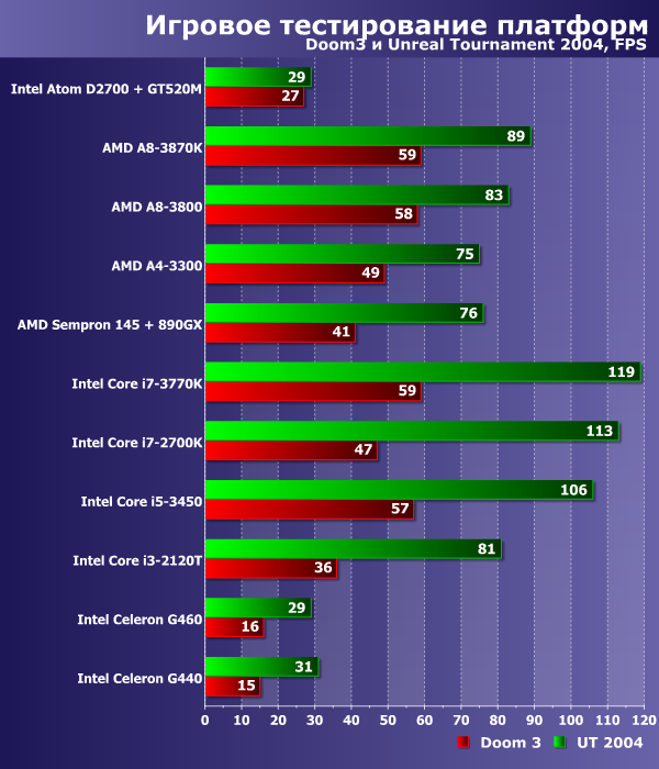 Полученные цифры говорят о том, что платформы на базе Intel Celeron G440 и G460 плохо подходят на роль даже очень слабой игровой машины. Почти так же плохо выступает связка Intel Atom D2700 с обновленным чипом NVIDIA Ion 2, но здесь определенно стоит винить именно процессор, а не графический чип.