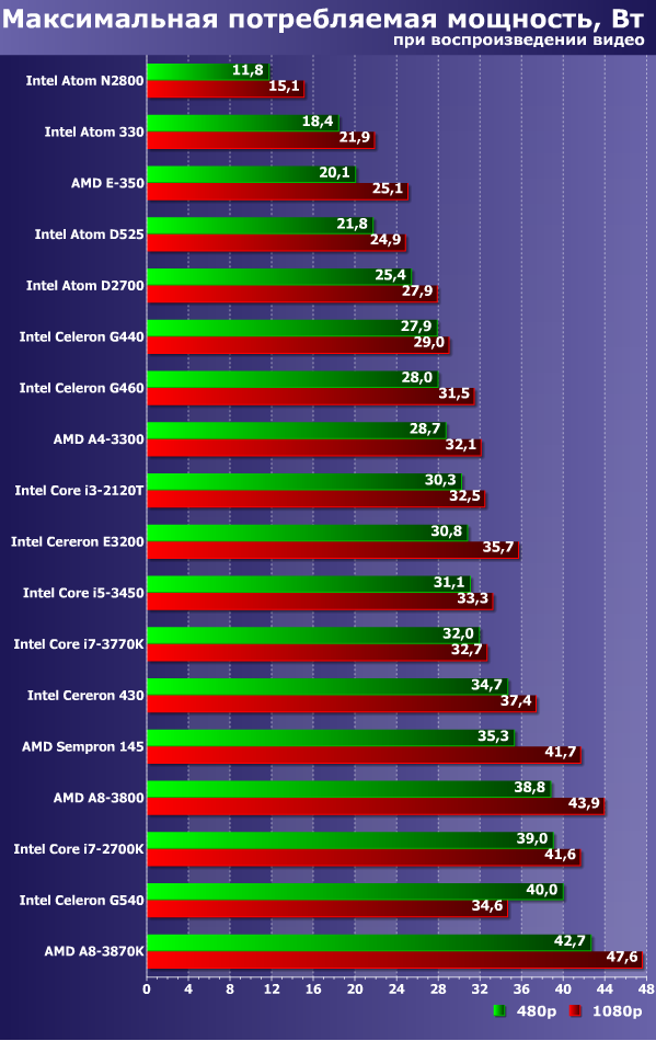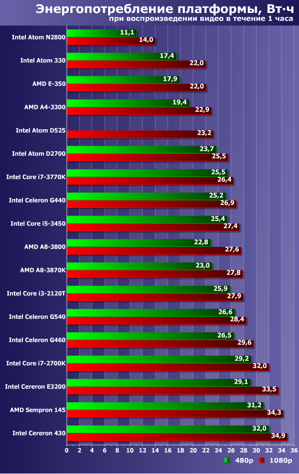 Поскольку в первой части тестирования не было раздела энергопотребления, в этом материалы мы приводим результаты измерений всех 18 платформ в режиме воспроизведения видео Full HD (Samsung Demo) и 480p. Кроме того, отдельной диаграммой приводится энергопотребление платформы за 1 час просмотра тех же роликов — эти данные, в отличие от максимальных значений потребляемой мощности, являются более сглаженными и, соответственно, более объективными. Все данные для более наглядного восприятия были отсортированы по возрастанию