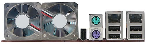 Грамотная разводка, с использованием для стабилизатора питания процессора большого количества полевых транзисторов, уложенным набок разъемом IDE, отсутствием обычной вереницы разъемов вдоль нижнего края платы, производит очень приятное впечатление. Разве что разъем FDD расположен как раз у нижнего края платы, и шлейф от него может не дотянуться до дисковода в высоком корпусе, но, впрочем, многим ли сейчас нужен этот дисковод? Определенно, место, высвобождаемое за счет применения маленьких по размеру слотов PCI-E x1, идет на пользу удобству разводки. Доступ к некоторым из имеющихся перемычек может быть затруднен при установке платы в корпус, краткое описание их функциональности на текстолите отсутствует. На плате установлен индикатор прохождения процедуры POST, выполненный в виде двух семисегментных светодиодов. Правда, несколько раздражает пластиковый воздуховод рядом с процессорным сокетом, который затрудняет установку кулера. В четырехканальном импульсном стабилизаторе напряжения питания процессора применены 4 конденсатора по 1000 мкФ, 5 по 680 мкФ и несколько менее емких. Также на плате находятся стабилизаторы напряжения шины PCI-E x16 (включающий 4 конденсатора по 1000 мкФ, усилен применением индуктивных элементов) и памяти (8 по 1000 мкФ, усилен применением индуктивных элементов). Вентилятором, вертикально установленным на радиаторе северного моста чипсета, Abit, видимо, начинает воплощать некоторые идеи форм-фактора BTX по регулировке воздушных потоков внутри корпуса.