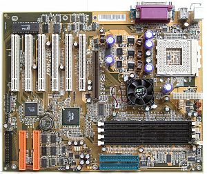 Сама же плата не выглядит столь аскетично — есть на ней IDE RAID от HighPoint и достаточно большой выбор настроек. Но обо все по порядку. Разводка не самая удачная — разъемы IDE RAID и дисковода расположены прямо за слотами PCI, что во-первых может создать некоторые трудности при установке длинномерных плат в эти слоты, а во-вторых явно не улучшит циркуляцию воздуха внутри корпуса. На плате нет встроенного звукового контроллера, от чего мы уже начинаем потихонечку отвыкать. Зато есть IDE RAID на базе микросхемы HPT370A — в результате чего мы имеем два лишних ATA100 канала, а также можем построить RAID уровней 0, 1, 0+1, тем самым повысив либо производительность, либо увеличив надежность дисковой подсистемы. На северном мосту чипсета находится радиатор с вентилятором — особой нужды в нем нет, но все же это может повысить стабильность платы при экстраординарном разгоне системы. Для этих же целей служат 6 конденсаторов по 4700 uF и 2 по 2200 uF каждый. Переключателей на плате не то чтобы мало, можно сказать что их почти что нет — всего один для очистки содержимого CMOS. Все функции по настройке платы находятся BIOS — а чего еще можно было ожидать от платы этого производителя?