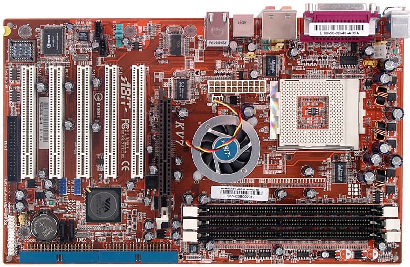 На плате отсутствуют разведенные, но нераспаянные элементы, что вполне логично, так как она является более современной из двух моделей, основанных на общей PCB: другая — KD7A — базируется на чипсете KT400A+VT8235 и соответственно этому ограничена в функциональности (у нее на текстолите не распаяны разъемы Serial ATA и один «лишний» разъем для пары портов USB 2.0).