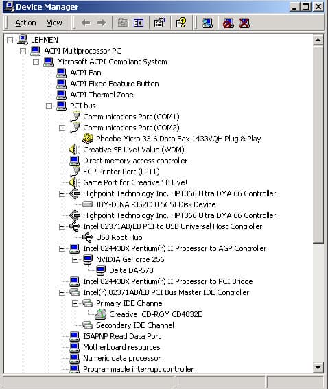 В состав Windows 2000 входят два системных ядра, которые специально предназначенны для ACPI совместимых машин. Это ACPI Uniprocessor PC и ACPI Multiprocessor PC. Второе зачастую является единственным способом получить на многопроцессорных системах полный набор функций по управлению питанием, в частности такую удобную функцию как автоматическое выключение машины. Однако, даже здесь не всё так просто. При установке ACPI ядра, все остальные устройства в системе подключаются через ACPI, в чём можно легко убедиться разсортировав их в Device Manager "By Connection":