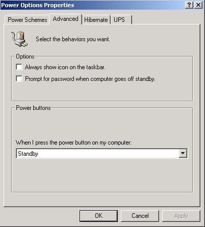 Кроме этого, если человеку необходимо отойти от рабочего места на незначительное время (например для… вариантов слишком много, вставте нужный самостоятельно), он может перевести машину в Sleep режим, и по возвражещению получить полностью рабочую машину, с уже открытыми приложениями и документами, над которыми он работал, за несколько секунд, без длительного ожидания пока система загрузится. Для этого служит функция Stand by, которая становится стандартной для всех современых ОС. Выход из Stand By возможен по нажатию клавиши мыши, по движению мыши, понажатию кнопки на клавиатуре, и ещё ряду факторов. Определяется это, как правило, в BIOS, раздел Power options. Переход в Stand by обычно производится выбором соответствующего пункта из меню появляющегося при выключении машины. Кроме этого, в последнее время появляется всё больше корпусов, на которых есть кнопка Sleep, которая позволяет вводить/выводить систему в энергосберегающий режим одним нажатием. Однако, далеко не все корпуса обладают подобной функцией, но благодаря гибкости, которую предоставляет ACPI для управления системой, в Windows 2000 возможно запрограмировать кнопку включения питания (которая есть на всех корпусах), что бы машина переходила в Stand by при нажатии на её: