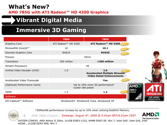 Выпущенный более года назад чипсет AMD 780G, не боясь показаться пафосными, можно назвать первой (и удачной!) попыткой наделить системные платы полноценным графическим процессором. Фактически, младшие (но современные на тот момент) дискретные видеокарты имели сравнимую 3D-производительность, а наличие блока UVD позволило декодировать HD-видео при наличии в качестве процессора даже представителей семейства Sempron, а более мощные процессоры ощутимо разгружались для иной работы. Надо отметить и поддержку полного набора видеовыходов, включая цифровые DVI, HDMI, Display Port, и интегрированный аудиокодек для вывода звукового потока на HDMI-приемник.