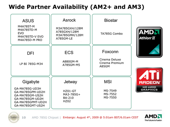 Уже на момент анонса чипсета, было известно о достаточно большом количестве плат, готовящихся к выпуску фактически всеми ныне действующими на рынке производителями плат. Разумеется, мы непременно протестируем наиболее интересные модели, когда они поступят в нашу лабораторию. А сейчас ознакомиться с возможностями чипсета на практике нам позволит плата Gigabyte MA785GT-UD3H, которая даже не попала на официальный слайд. То есть, учитывая упомянутые на слайде 6 моделей Gigabyte, и вспоминая высокую активность этой компании по освоению предыдущих чипсетов, можем сделать вывод, что Gigabyte явно понравилось конструировать платы на интегрированных чипсетах от AMD. И она, вероятно, хочет повторить успех таких несомненных хитов, как MA78GM-DS2H и MA790GP-DS4H.