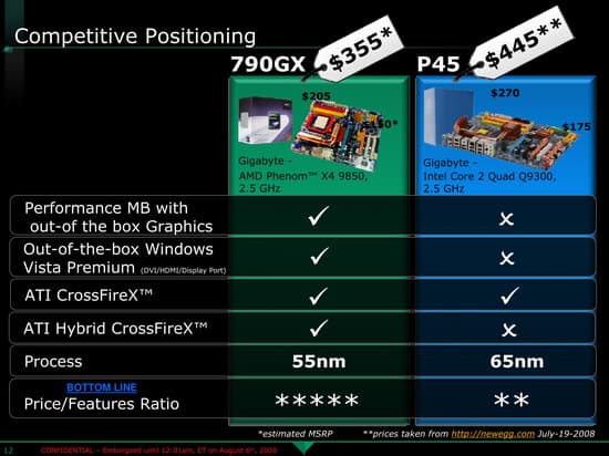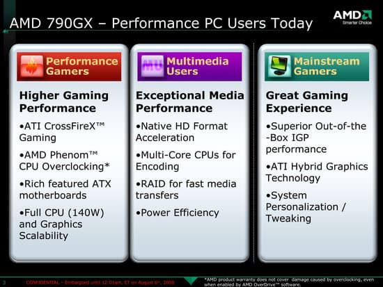Именно по этой причине чипсет попадает в одну группу с 790X, ну а 790FX остается специализированным чипсетом для тех, кто, например, планирует выжать максимум производительности из пары Radeon HD 4870 X2 в режиме CrossFire и хотел бы получить в свое распоряжение два порта x16. Мы на этот раз, пожалуй, не будем изображать из себя скептиков и говорить, что мол, 8 линий достаточно во всех случаях, поскольку это PCI Express 2.0 и эквивалентно 16-линиям в первой версии. Для упомянутой парочки может и не хватить, во всяком случае, есть все основания проверить на практике, когда эти карты будут доступны. Впрочем, ультимативными конфигурациями, применимость CrossFire с выходом серии Radeon HD 4800 не ограничивается, например, очень интересной и по производительности в абсолютных величинах, и даже по соотношению цена/производительность (что вообще редкость для двухвидеокарточных систем) на сегодняшний день выглядит CrossFire-связка из двух Radeon HD 4850. И вот для такой системы платы на 790GX могут оказаться идеальным вариантом.