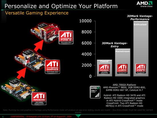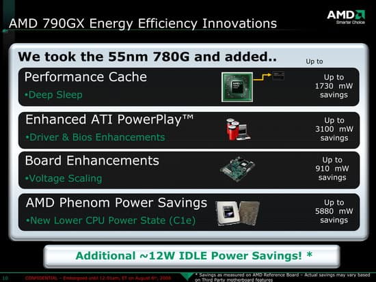 Любопытно, что AMD первой реализовала идею переключаемой графики в ноутбуках, причем еще в прошлом поколении чипсетов (RS690M) и переключение на интегрированное ядро происходит в автоматическом режиме (при переходе на питание от батарей). Однако для настольных чипсетов гибридную функциональность было решено не вводить, что довольно неожиданно. Вместо этого AMD совершенствует технологию PowerPlay, которая позволяет эффективно отключать незадействуемые блоки в графических процессорах, как мобильных, так и настольных, включая и чипсетные графические ядра и, разумеется, работает это полностью автоматически под управлением BIOS и драйверов. Надо отметить, что видеокартами от NVIDIA такая функциональность, напротив, не поддерживается, поэтому пока сложно сказать, чей подход в действительности продемонстрирует лучший результат. Это покажут замеры энергопотребления.