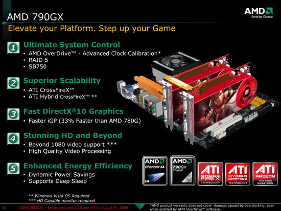 Кроме того, для плат на этом чипсете обязательна поддержка процессоров с TDP до 140 Вт, соответствующим образом должен быть спроектирован преобразователь питания на плате, тогда как для 780G никаких ограничений не вводилось (что также оправдано, если разработчик собирается выпустить компактную плату для медиацентра, он волен ограничить мощность, выдаваемую преобразователем хоть до 65 Вт, и это вполне устроит сборщиков подобных систем).