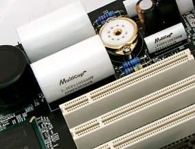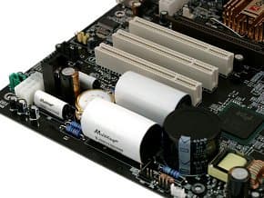 В трехканальном импульсном стабилизаторе напряжения питания процессора применены 8 конденсаторов по 3300 мкФ и 3 по 2200 мкФ.