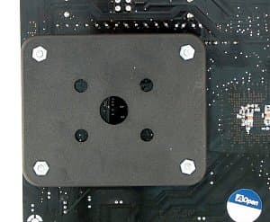 Для защиты от перегибов текстолита при установке массивных процессорных кулеров на оборотной стороне платы смонтирована специальная металлическая пластина.
