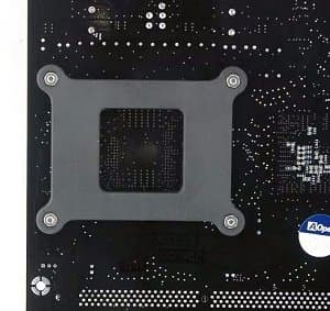 На оборотной стороне платы смонтирована защитная пластина для предотвращения изгиба текстолита при установке массивных процессорных кулеров.