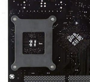 На оборотной стороне платы смонтирована защитная пластина для предотвращения изгиба текстолита при установке массивных процессорных кулеров.