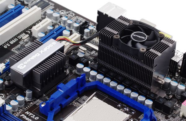 Система охлаждения основательная и имеется даже вентилятор на одном из радиаторов, объединенных тепловой трубкой. Мы уже привыкли к полностью пассивным схемам охлаждения чипсетов, поскольку с технической точки зрения все современные чипсеты, тем более, при работе в штатном режиме, могут охлаждаться пассивно, а 890FX и в особо громоздких радиаторах не нуждается. Но есть нюанс, в отношении абсолютно любых систем пассивного охлаждения: их эффективность находится в гораздо большей зависимости от температуры окружающей среды по сравнению с активной системой охлаждения, даже имеющей очень скромный по размерам и производительности вентилятор. Иными словами, если в корпусе вдруг по тем или иным причинам окажется «слишком жарко», например, летом или из-за продолжительной нагрузки на видеокарту или процессор, даже очень солидная система пассивного охлаждения может не справиться со своей задачей, за исключением случаев, когда часть такой системы находится вне корпуса, как у некоторых плат DFI и Gigabyte. Шум от этого вентилятора более чем умеренный, вероятность его расслышать в закрытом корпусе практически отсутствует.