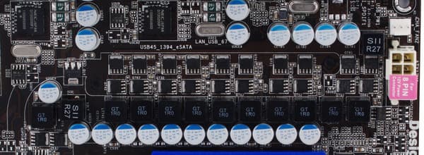 Стабилизатор напряжения питания процессора: 10-канальный, во всех каналах установлено по 2 полевых транзистора, установлены 11 конденсаторов по 820 мкФ и 4 — по 270 мкФ, все конденсаторы на плате твердотельные. Заявлена поддержка процессоров с TDP до 140 Вт включительно. Схема практически одинакова с платой ASRock 890GX Extreme3 на чипсете 890GX и сильно напоминает аналоги на современных платах ASUS того же класса.