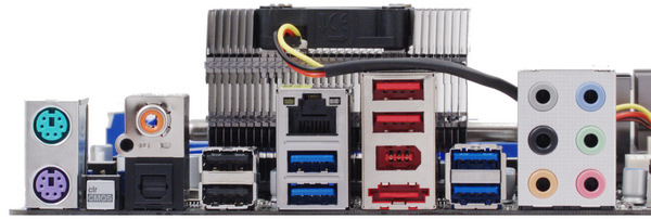 Несмотря на то, что плата целиком занимает, отведенную по стандарту ATX, площадь, на ней практически нет свободного места, и разработчикам даже пришлось прибегнуть к размещению периферийных портов в нетипичных местах. Ведь дополнительное ограничение накладывается в виду необходимости расчистить место для крупногабаритных видеокарт. При этом наряду с актуальными интерфейсами (USB 3.0, FireWire, дополнительные SATA-выходы), на плате сохранены и устаревающие IDE, COM и FDD. Само по себе это неплохо, но вот размещение двух дополнительных SATA-выходов в углу, за крайним PCI-слотом, кажется не совсем удачным, тянуть сюда шлейфы от винчестеров, установленных в отсеках на передней стенке корпуса, не слишком удобно. Впрочем, можно использовать эти порты для вывода дополнительных eSATA-разъемов (вернее одного разъема, второй и так является «дублем» eSATA на задней панели.