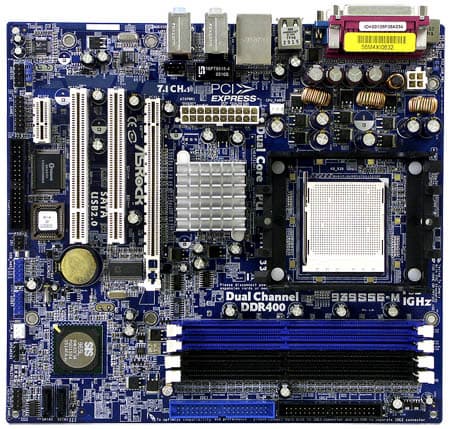 В трехканальном импульсном стабилизаторе напряжения питания процессора применены 6 конденсаторов по 3300 мкФ и 4 по 1200 мкФ, также на плате находится стабилизатор напряжения памяти (включающий 6 конденсаторов по 1000 мкФ). В критических цепях применены в основном электролитические конденсаторы от компаний OST (наличие которых особого восторга не вызывает) и United Chemi-Con. На плате нет разведенных, но не распаянных элементов, что вполне естественно, так как 939S56-M — это пока единственная модель компании ASRock под Socket 939 на чипсете SiS756. Размер платы — 244х224 мм (чуть меньше стандартного microATX), крепление к корпусу шестью винтами, край платы слегка провисает.