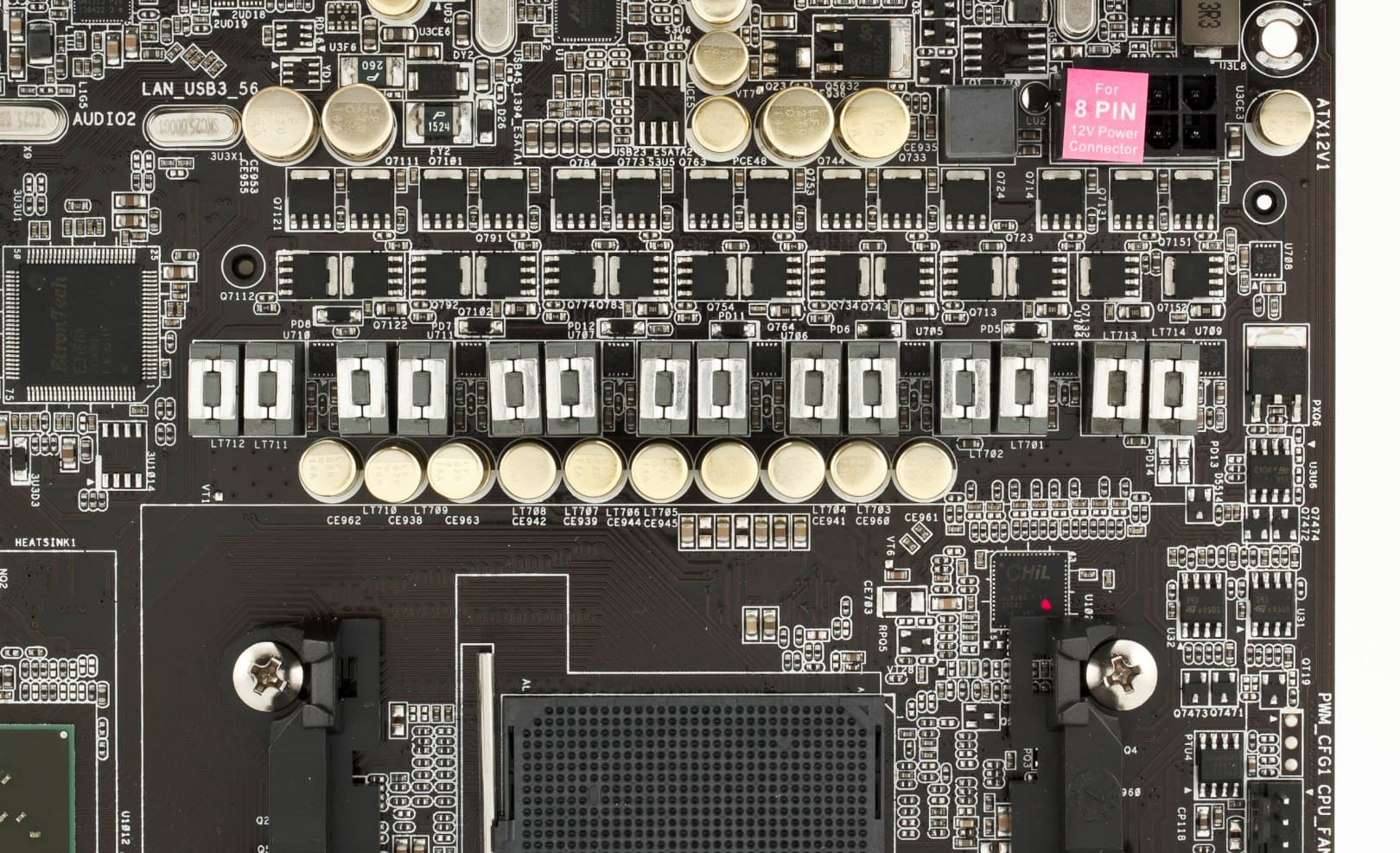 Каждая «виртуальная» фаза имеет по 2 высокоэффективных полевых транзистора с Low RDS(on). Установлены 10 высококачественных твердотельных конденсаторов по 820 мкФ и 4 — по 270 мкФ. Заявлена поддержка процессоров с TDP до 140 Вт включительно.