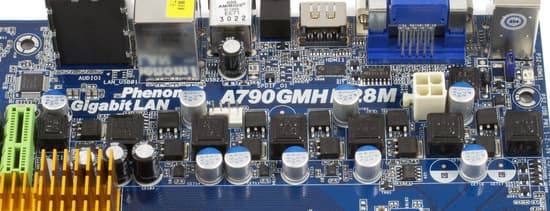 Стабилизатор напряжения питания процессора: 5-канальный (один канал выделен для питания, встроенного в процессор, северного моста), во всех каналах применены по 2 полевых транзистора. В схеме установлены 5 твердотельных конденсаторов по 820 мкФ и 3 — по 270 мкФ. Заявлена поддержка процессоров с TDP до 125 Вт включительно.