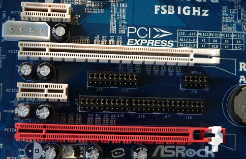 Для выбора схемы разделения PCIE-линий между графическими портами служат перемычки. Надо отметить, что при установке единственной видеокарты и переключении первого графического порта в полноскоростной режим, второй не может быть использован для установки каких-либо плат вовсе.