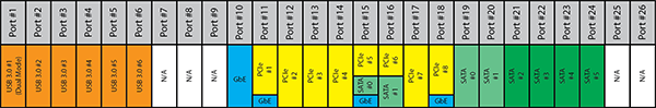 Напомним, что чипсет Intel B150 имеет только 8 портов (линий) PCI Express 3.0, до 6 портов USB 3.0 и до 6 портов SATA 6 Гбит/с. Еще один высокоскоростной порт чипсета специально выделен для PHY-уровня сетевого контроллера (если таковой используется). В отличие от чипсета Intel Z170, где часть высокоскоростных портов ввода/вывода разделяются между портами USB 3.0 и PCIe 3.0, а также между портами PCIe 3.0 и SATA 6 Гбит/с, в чипсете Intel B150 все предельно просто и ничего не разделяется. Исключение составляют лишь два порта (#15 и #16), которые могут быть портами PCIe 3.0 или SATA 6 Гбит/с. Схема распределения высокоскоростных портов ввода/вывода чипсета Intel B150 приведена на рисунке: