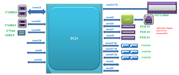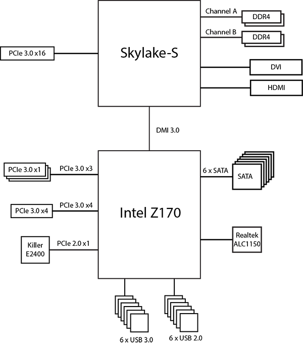 Во всем остальном эти платы одинаковые. Точнее, почти одинаковые. Дело в том, что на плате ASRock Fatal1ty Z170 Gaming K4 два слота PCI Express x1 реализованы на базе чипсетных высокоскоростных портов #25 и #26. Схема подключения контроллеров, слотов и разъемов на плате ASRock Fatal1ty Z170 Gaming K4 приведена далее: