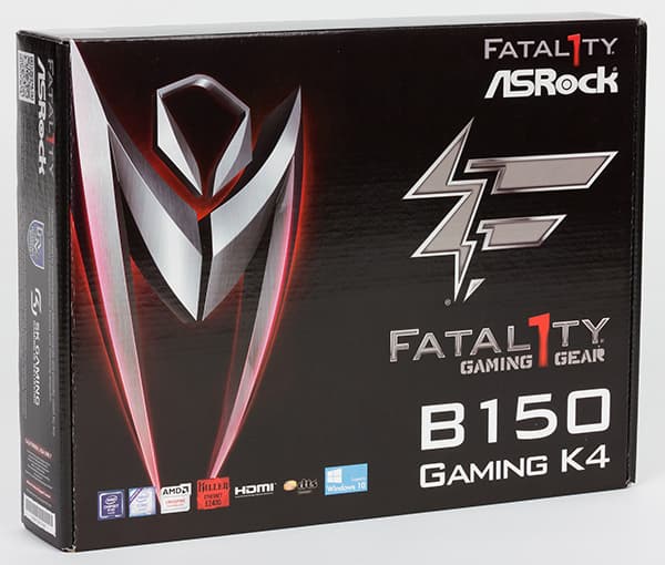 Плата ASRock Fatal1ty B150 Gaming K4 поставляется в достаточно компактной коробке черного цвета с кратким описанием всех достоинств платы и таблицей спецификации.