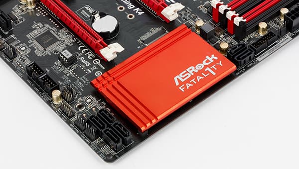 Для охлаждения различных тепловыделяющих компонентов на плате ASRock Fatal1ty B150 Gaming K4 предусмотрено в совокупности три радиатора. Один отдельный радиатор установлен на чипсете, а еще два небольших радиатора расположены по двум сторонам процессорного разъема и предназначены для отвода тепла от MOSFET-транзисторов регулятора напряжения питания процессора.