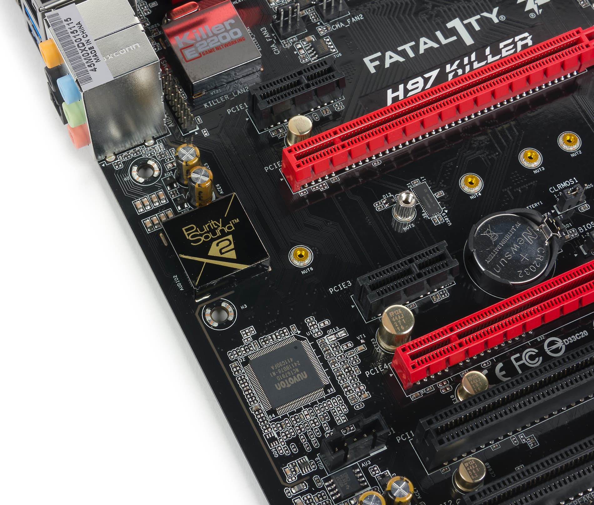 Если подсчитать количество контроллеров, разъемов и слотов, использующих порты PCI Express 2.0 чипсета Intel H97, то получится следующая картина. На два слота PCI Express 2.0 x1 и слот PCI Express 2.0 x4 требуется в совокупности шесть портов PCI Express 2.0. Еще один порт PCI Express 2.0 задействует мостик ASMedia ASM1083. Кроме того, сетевой контроллер Qualcomm Atheros Killer E2200 — это еще один порт PCI Express 2.0. Ну и по два порта требуется под M.2 и разъем SATA Express.