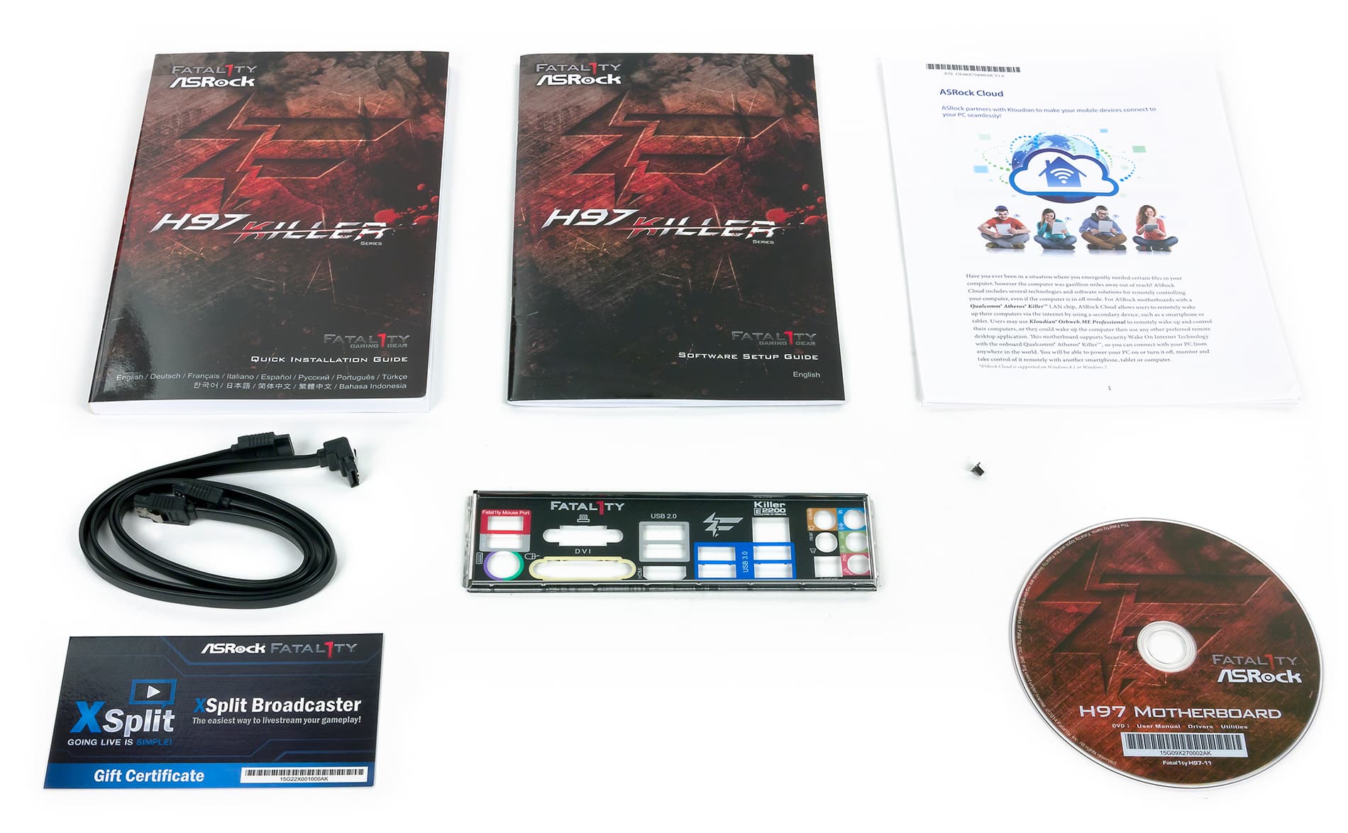 Плата ASRock Fatal1ty H97 Killer поставляется в довольно скромной компактной картонной коробке, на которой расписаны все ее достоинства и даже приводится краткая спецификация. Комплект поставки минимальный: кроме самой платы имеется лишь инструкция пользователя, DVD-диск с программным обеспечением и драйверами, два SATA-кабеля (все разъемы с защелками, один кабель имеет угловой разъем с одной стороны) и заглушка для задней панели платы.