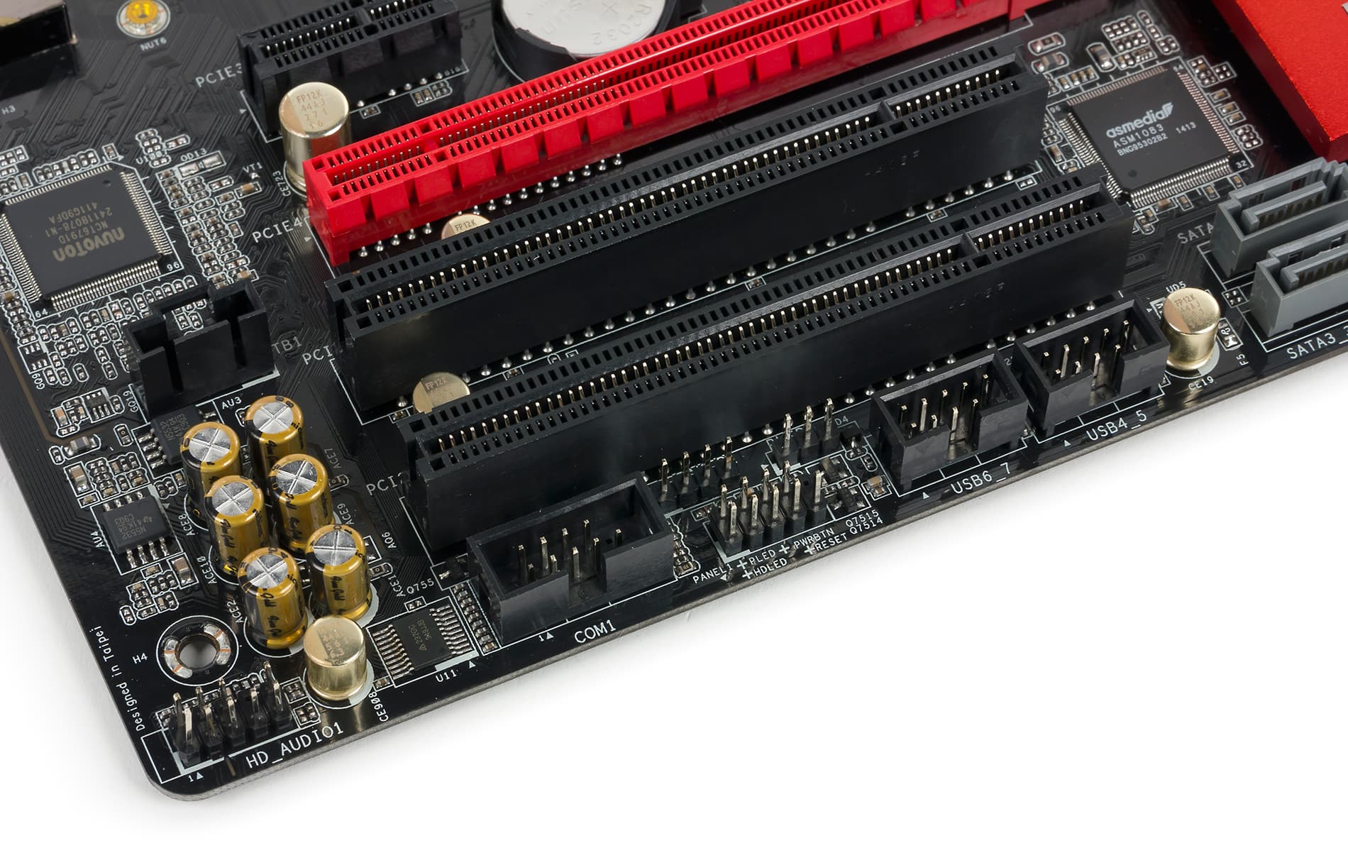 Первый слот с форм-фактором PCI Express x16 (ближайший к процессорному разъему) выполнен с использованием 16 портов PCI Express 3.0 процессора Haswell. Этот слот всегда работает в режиме x16, то есть является слотом PCI Express 3.0 x16. Второй слот с форм-фактором PCI Express x16 выполнен с использованием 4 портов PCI Express 2.0 чипсета Intel H97, то есть является слотом PCI Express 2.0 x4, но в форм-факторе PCI Express x16.