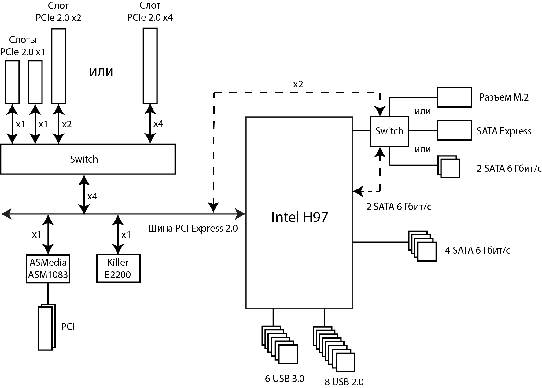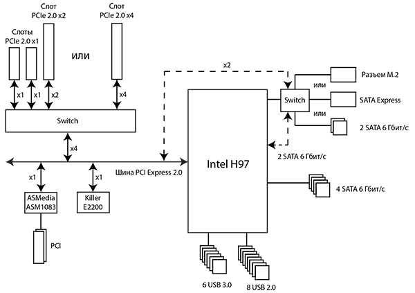 Схема подключения всех контроллеров слотов и разъемов к чипсету Intel H97 показана на рисунке.