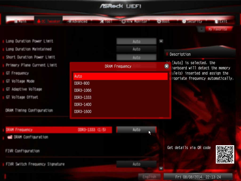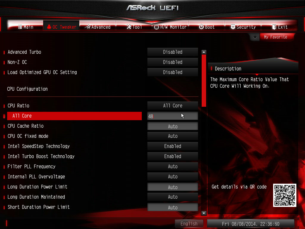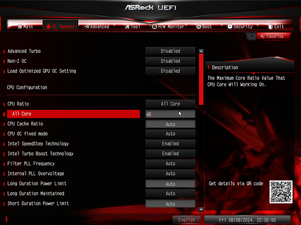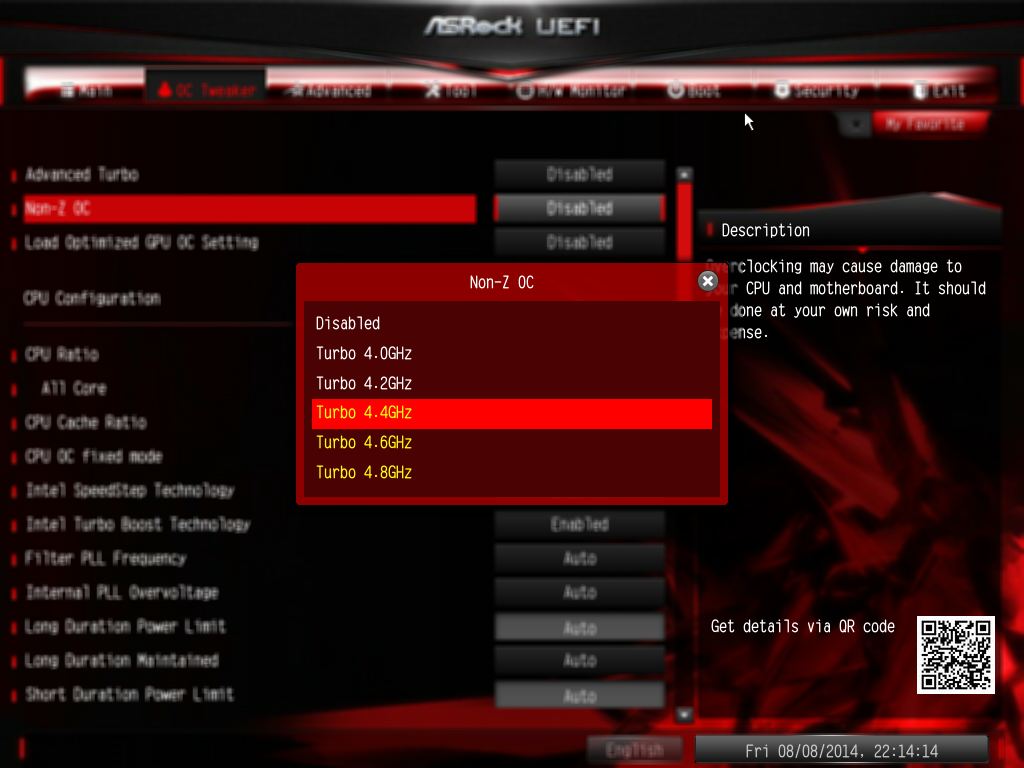 Тем не менее, процессор Intel Core i7-4770K можно на этой плате разогнать и до частоты 4,8 ГГц, но для этого лучше воспользоваться параметром Non-Z OC (раздел OC Tweaker), который позволяет выбрать один из пяти предустановленных режимов разгона. В частности, при выборе режима Turbo 4.8GHz процессор будет работать на частоте 4,8 ГГц. Причем в этом случае меняется не только коэффициент умножения, но и напряжение питания, а также настраивается режим Intel Turbo Boost по максимальному энергопотреблению.