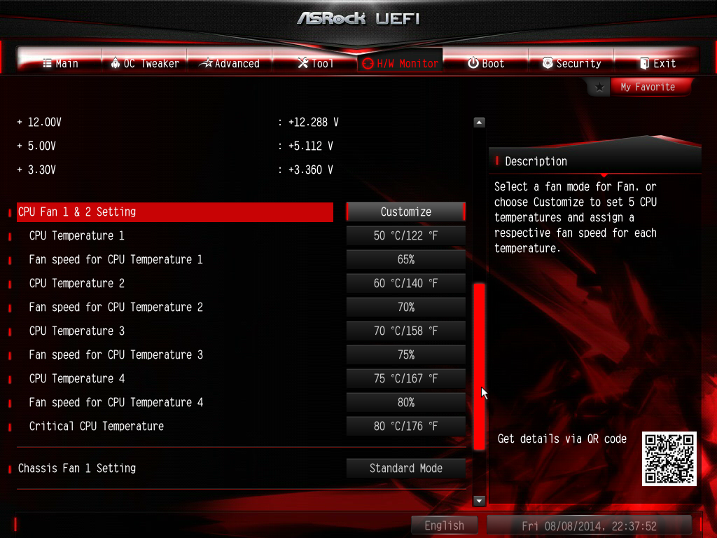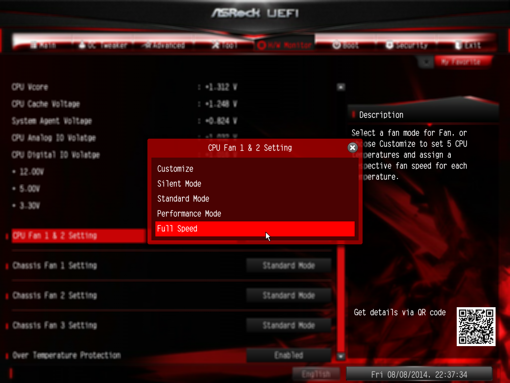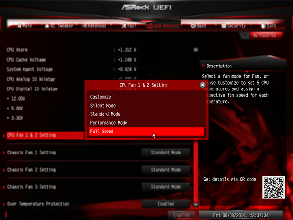 Еще одна полезная настройка в UEFI BIOS — это возможность управления режимом работы подключенных к плате вентиляторов. Для двух вентиляторов кулера процессора, а также для двух дополнительных корпусных вентиляторов имеется возможность выбрать один из четырех предустановленных скоростных режимов работы (Full Speed, Performance Mode, Standart Mode, Silent Mode) или по пяти точкам построить график зависимости скорости вращения вентилятора от температуры. Скорость вращения вентилятора задается в процентах (от 0 до 100%). Причем если речь идет о вентиляторе кулера процессора, то его скорость привязывается к температуре процессора, которая задается в диапазоне от 30 до 80 °С. Ну а для дополнительных корпусных вентиляторов можно в качестве привязки выбрать как температуру процессора, так и температуру датчика на материнской плате (в диапазоне от 60 до 80 °С).