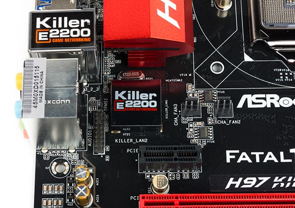 Для подключения к сегменту локальной сети на плате ASRock Fatal1ty H97 Killer реализован гигабитный интерфейс на базе сетевого контроллера Qualcomm Atheros Killer E2200, который оптимизирован именно для онлайн-игр и онлайн-контента (видео, аудио и т. п.). Данный контроллер позволяет динамически подстраиваться под интернет-трафик и обеспечивать минимальные задержки в сетевых играх. Кроме того, имеется возможность устанавливать приоритеты для сетевых приложений.