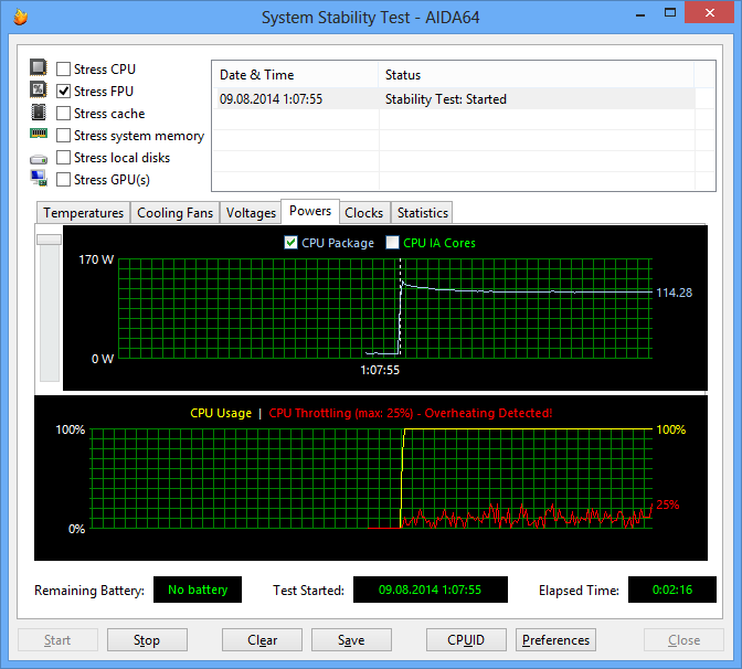 При загрузке процессора стресс-тестом Stress FPU, который в значительно большей степени нагревает процессор, наступал перегрев процессора и режим Throttling. Частота процессора опускалась до 3,0 ГГц, а его энергопотребление составляло 115 Вт. Но главное, что система при этом не зависала и не «умирала».