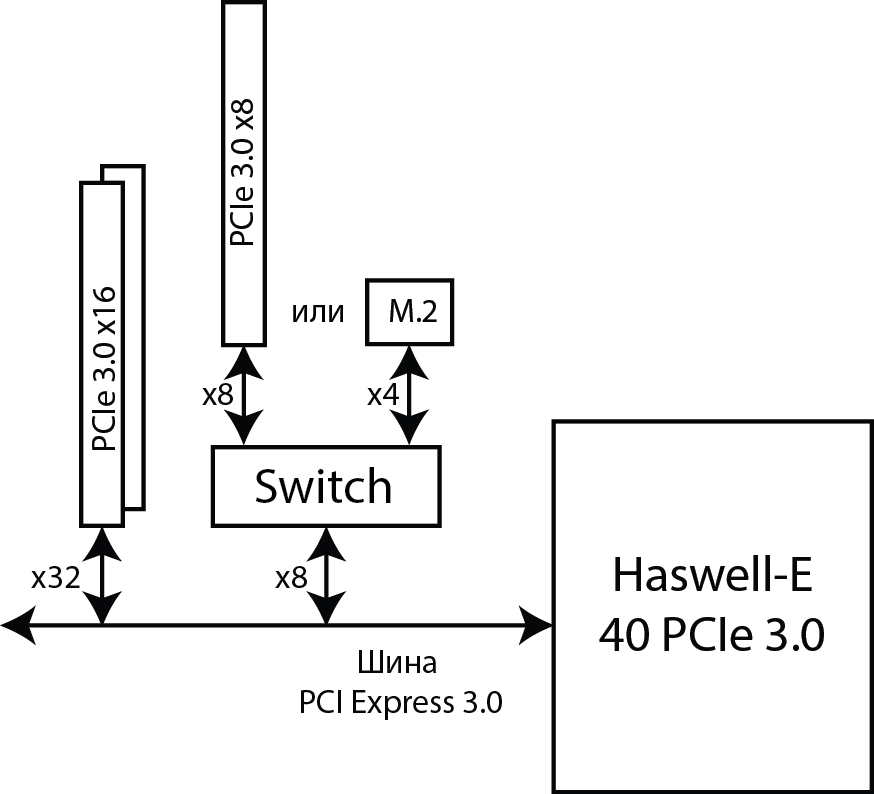 Слоты PCI Express 2.0 x1 и разъем Mini-PCIe реализованы с использованием чипсетных портов PCI Express 2.0, а слоты с форм-фактором PCI Express x16, а также разъем M.2 реализованы с использованием линий PCI Express 3.0 процессора Haswell-E (Haswell-EP). Если считать от процессорного разъема, то первый слот с форм-фактором PCI Express 3.0 x16 всегда работает как PCI Express 3.0 x16. Второй слот с форм-фактором PCI Express x16 переключаемый и может работать на скорости x16 или x8. Третий слот также переключаемый, и для него скорость может быть x8 или x4. В том случае, если на плату устанавливается процессор Haswell-E/EP c 40 линиями PCI Express 3.0, слоты с форм-фактором PCI Express x16 будут работать в режиме x16/x16/x8 (при условии, что разъем M.2 не задействуется). Поскольку разъем M.2 требует использования четырех линий PCI Express 3.0, он сделан разделяемым с третьим слотом с форм-фактором PCI Express x16. То есть либо задействуется слот M.2, и тогда третий слот с форм-фактором PCI Express x16 будет недоступен, либо задействуется третий слот с форм-фактором PCI Express x16, и тогда будет недоступен разъем M.2.