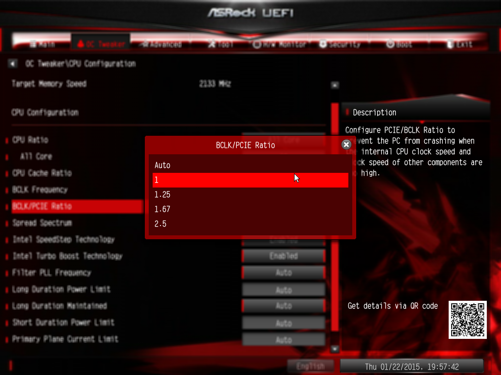 Разгон процессора возможен не только путем увеличения коэффициента умножения, но и за счет изменения опорной частоты для ядер процессора. На вкладке OC Tweaker можно задавать частоту BCLK Frequency и частотный множитель BCLK/PCIE Ratio.