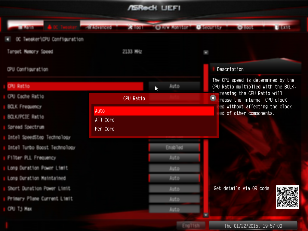 При активированной технологии Intel Turbo Boost разгон процессора Haswell-E путем изменения коэффициента умножения можно реализовывать в двух режимах: задавать коэффициент умножения для каждого случая числа загруженных ядер процессора и задавать коэффициент умножения одновременно для всех загруженных ядер процессора.