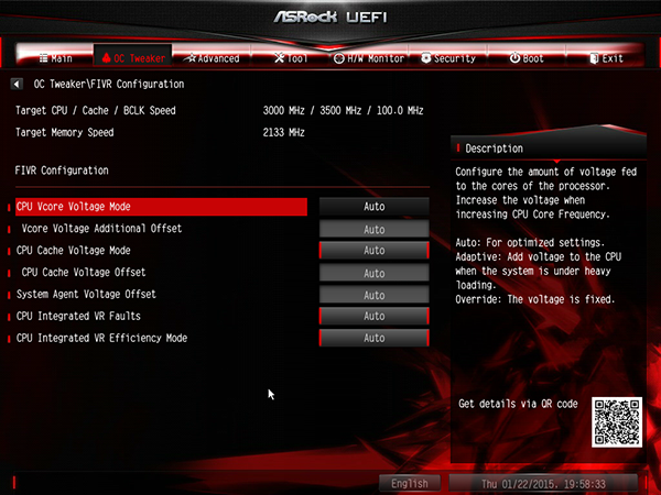 По всей видимости, проблема заключается в том, что при таком способе разгона напряжение питания ядер процессора устанавливается недостаточно высоким. Мы попробовали вручную. повысить напряжение питания на ядрах процессора до 1,249 В (это то самое значение, которое автоматически устанавливается на платах Asus при коэффициенте умножения 42) и процессор Intel Core i7-5960X «завелся» на частоте 4,2 ГГц.