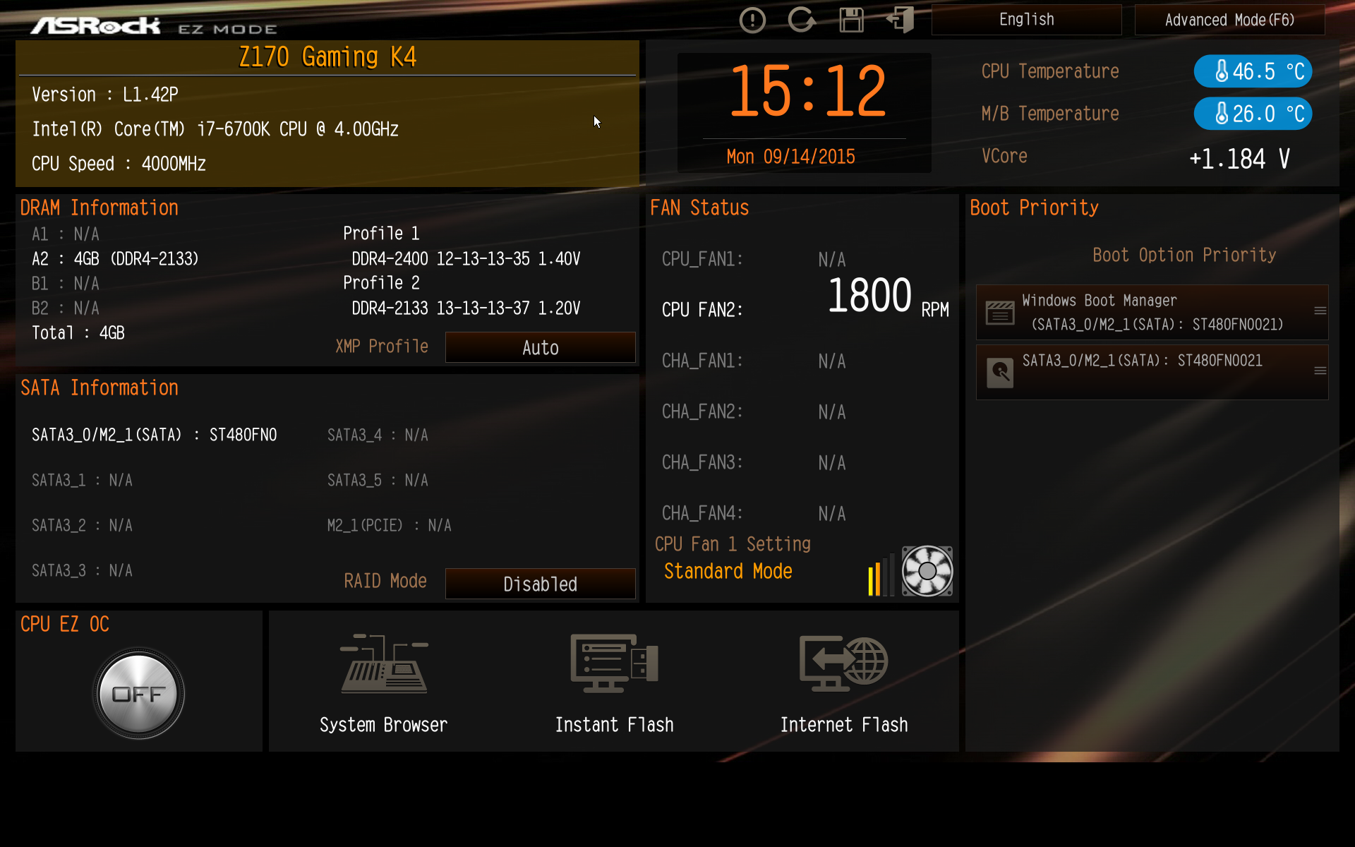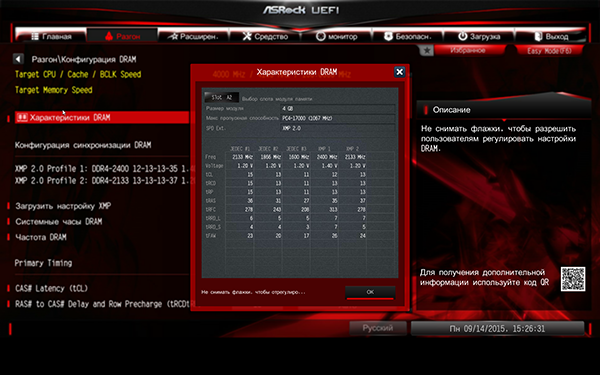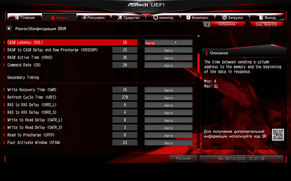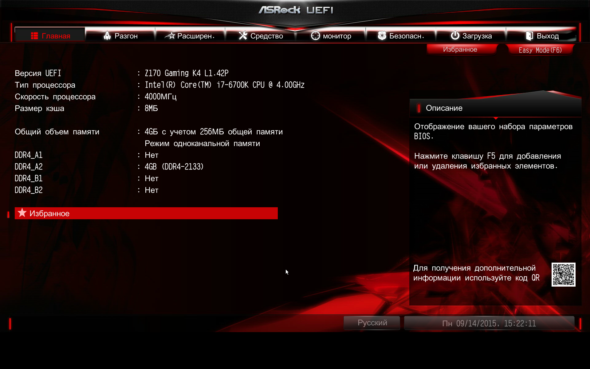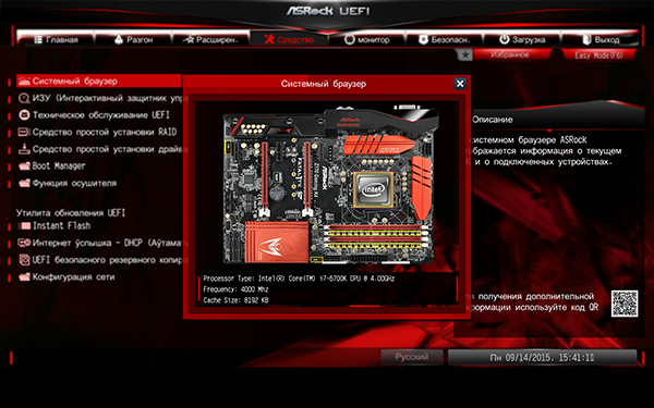 И по функциональным возможностям, и по интерфейсу UEFI BIOS на плате ASRock Fatal1ty Z170 Gaming K4 не отличается от UEFI BIOS на плате ASRock Z170 Extreme6, которую мы уже рассматривали. Разница заключается лишь в другой цветовой гамме интерфейсе и в наличии режима отображения EZ Mode.