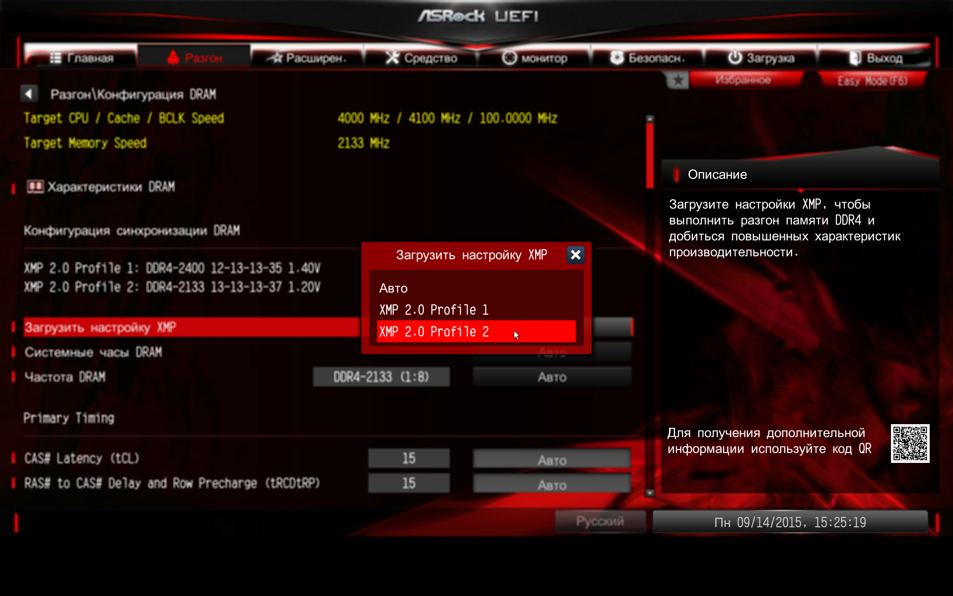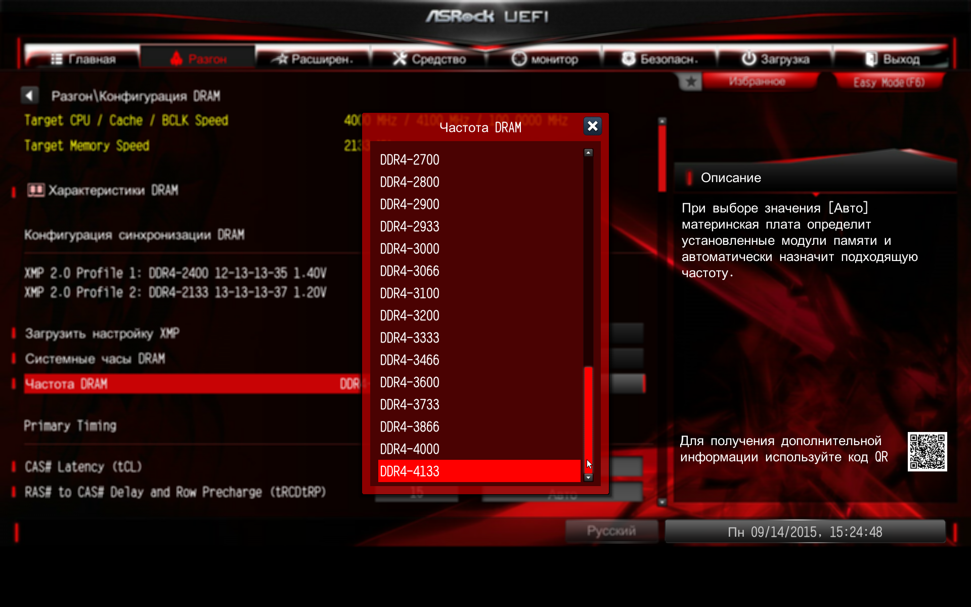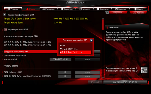 На этой вкладке можно установить частоту памяти DDR4 вплоть до 4133 МГц. Конечно же, имеется возможность настройки таймингов памяти и активирования XMP-профиля.