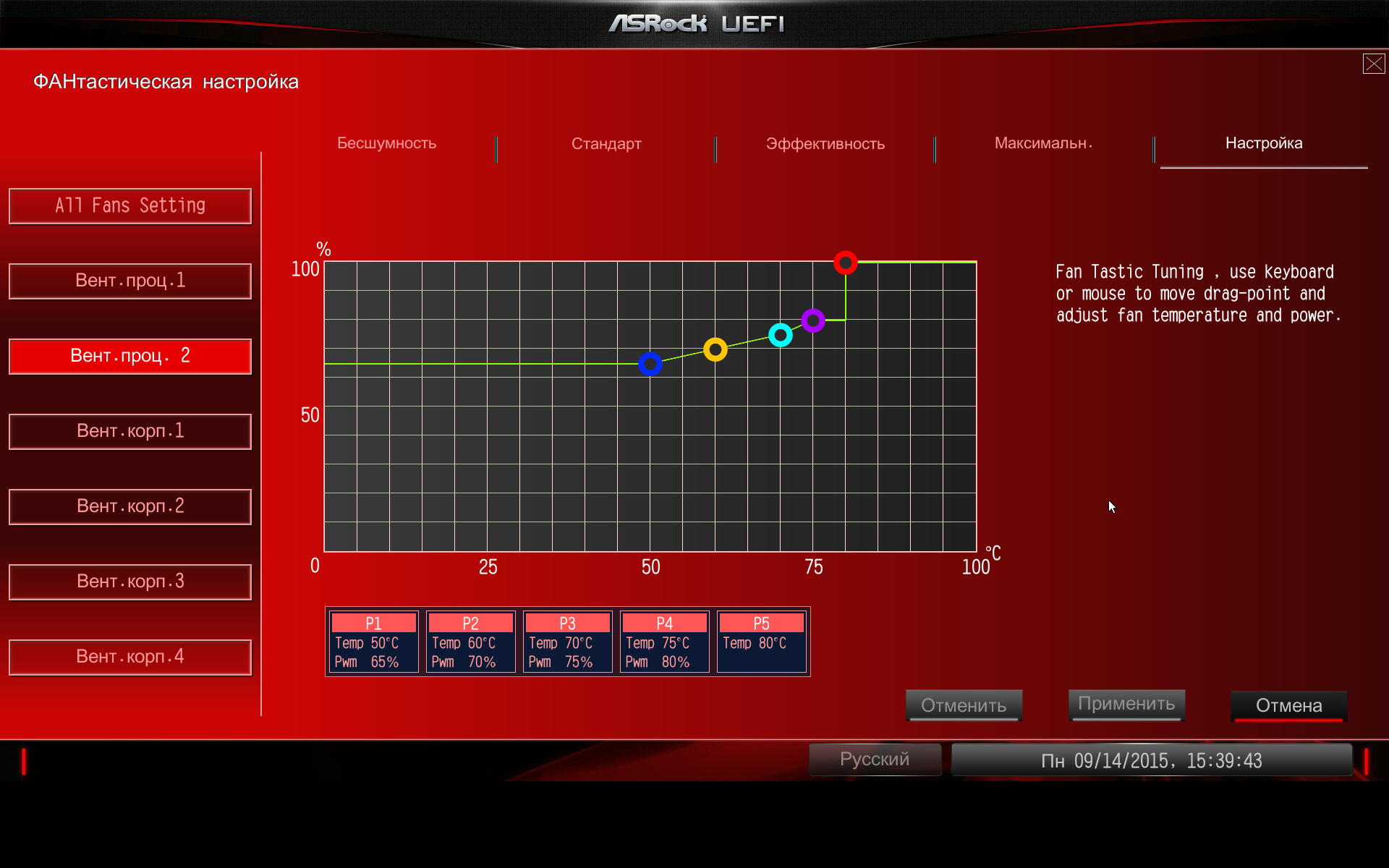 Для всех вентиляторов имеется возможность выбрать один из четырех предустановленных скоростных режимов работы или по пяти точкам построить график зависимости скорости вращения вентилятора от температуры процессора или материнской платы.