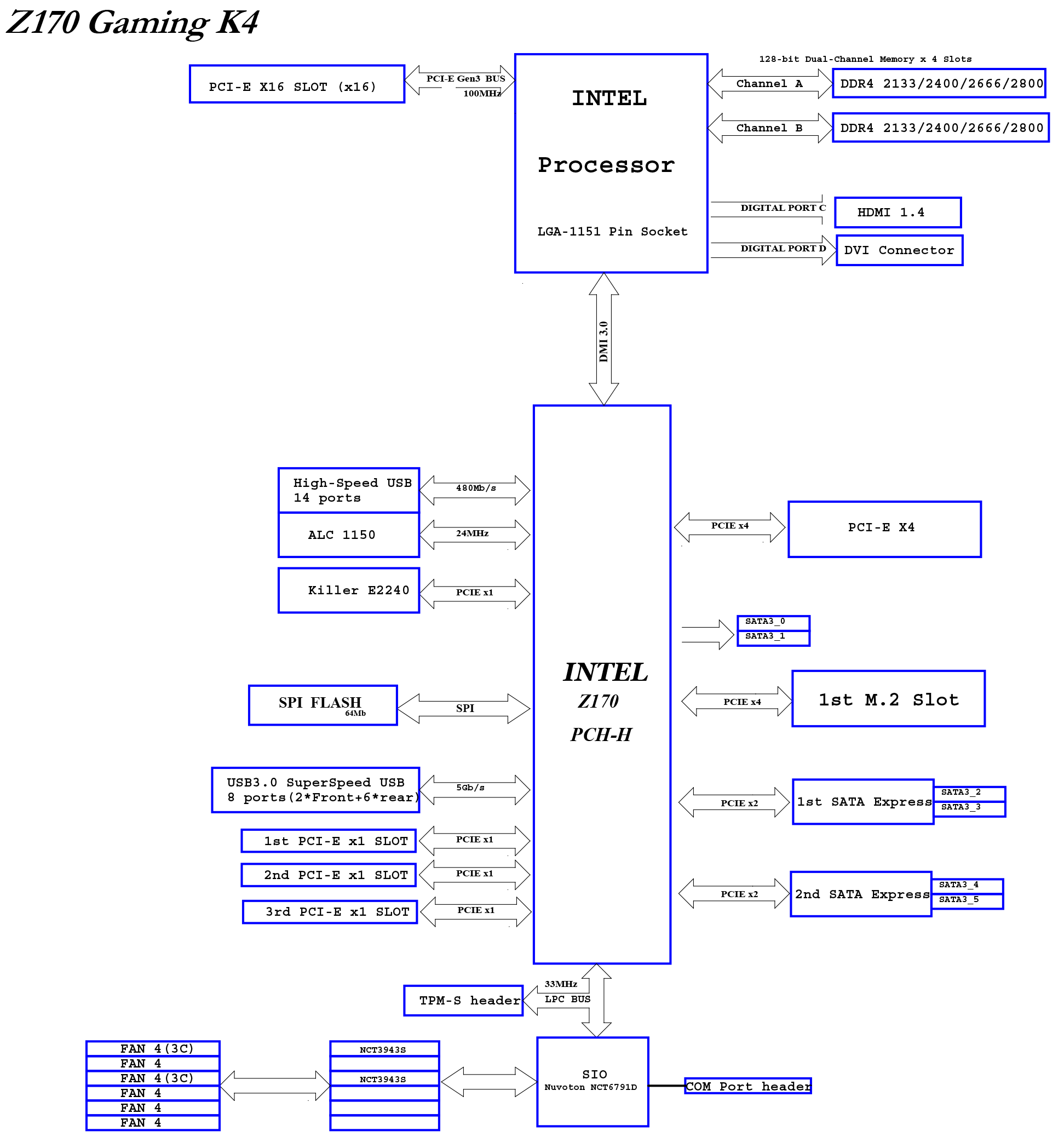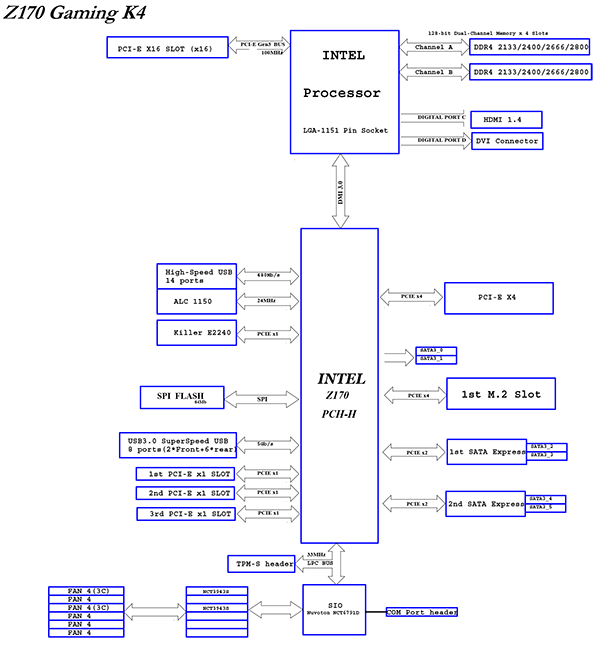 Блок-схема платы ASRock Fatal1ty Z170 Gaming K4, предоставленная по нашей просьбе компанией ASRock, приведена на рисунке (на мелкие ошибки, типа неправильно указанной модели сетевого контроллера, внимание не обращаем).