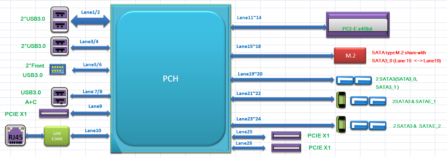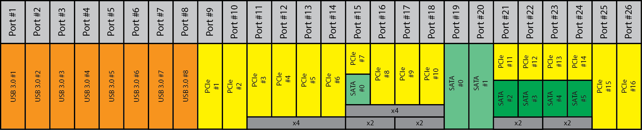 На приведенной блок-схеме не очень понятно, что и как разделяется. Кроме того, не очень понятно, почему на этой схеме к разъемам SATA Express и M.2 вообще не подведены линии SATA. А потому, приведем еще одну, более наглядную схему, на которой показано к каким именно высокоскоростным портам чипсета Intel Z170 что подключено. Но прежде, для наглядности, приведем общую схему распределения 26 высокоскоростных портов ввода-вывода чипсета Intel Z170: