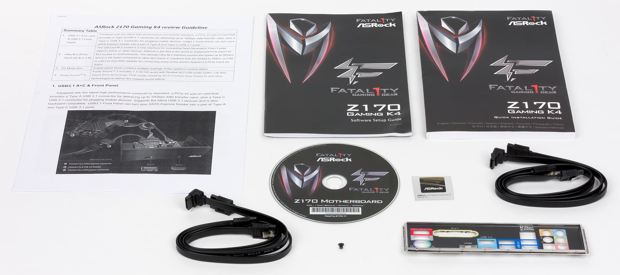 Комплект поставки очень скромный. Кроме самой платы в коробку вложены инструкция пользователя (есть краткое описание и на русском языке), DVD-диск с программным обеспечением и драйверами, четыре SATA-кабеля (все разъемы с защелками, два кабеля имеют угловой разъем с одной стороны) и заглушка для задней панели платы.