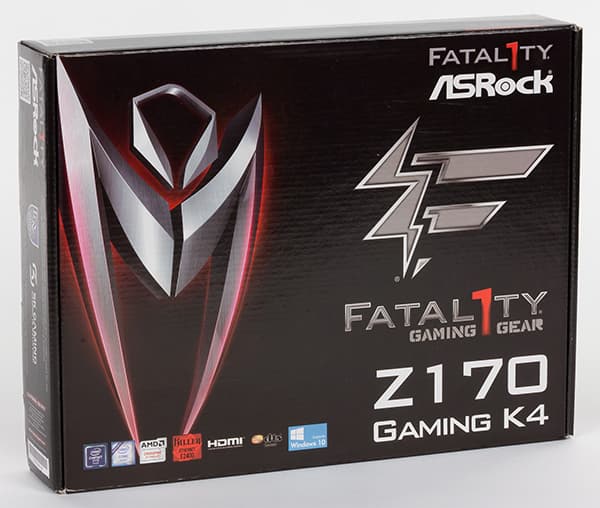 Плата ASRock Fatal1ty Z170 Gaming K4 поставляется в достаточно компактной коробке черного цвета с кратким описанием всех достоинств платы и таблицей спецификации.